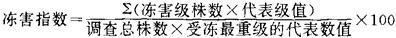 以此比较遭受冻害的轻重。一般将树木冻害程度按叶、枝、干受冻表现分为0~5级,用其评定和统计受冻树木各级的株数,进而将冻害调查结果计算其冻害指数。计算公式: