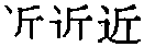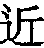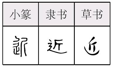 【提示】辶,3画,上面一点;旧字形4画,多一点; 第二笔宋体是横折,楷体是横折折撇。 *近jìn7画 辶部 (1) 空间或时间距离短(与“远”相对): ~邻|附~|远~闻名|~来|~年|离春节越来越~了。 (2) 接近;相差不远: ~似|观点相~|~半个世纪。 (3) (关系)亲密: 亲~|套~乎|邻居越走(来往)越~。 (4) 浅显: 浅~|言~旨远。 近 ☚ 逐 迫 ☛ 近jìn《说文》所载战国文字从止(趾),斤声。商代时辵旁多作止旁,如追、逐、进(進)等。周初还有些,如过(過)字。近字是附近,不远义。指距离短。如:路很近。指现在以前不久的时间。如:近几天|近来。又指接近,差别小,差不多。如:相近|近似|年近五十。又指浅近。如:言近旨远。引申为亲密,关系密切。如:亲近|近亲。 近★常◎常
