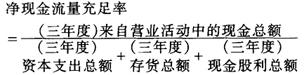 | 释义 | 净现金流量充足率 企业经营活动产生的现金所能负荷的资本支出、存货净增数和发放现金股利的程度。 为避免其重复性和不稳定性因素的影响,计算时通常以三年或五年的总数为计算基础,其计算公式为: