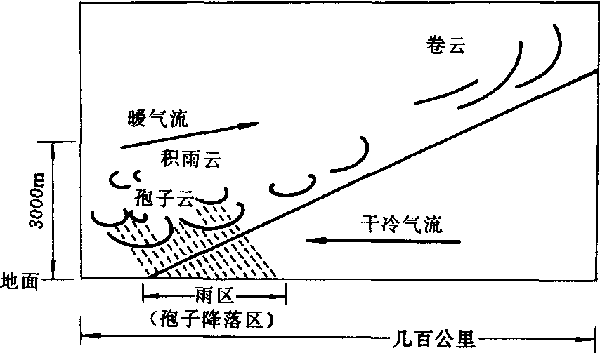 图1 冷锋过境降雨和病害远程传播 (曾士迈1986)