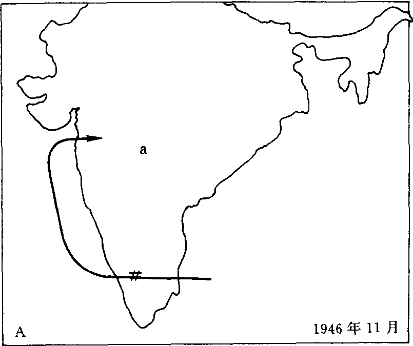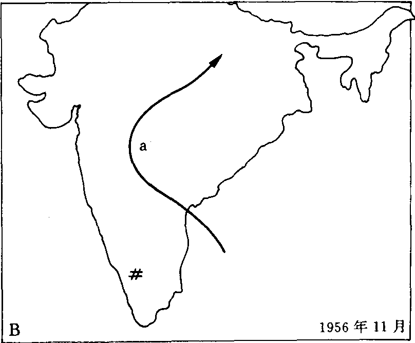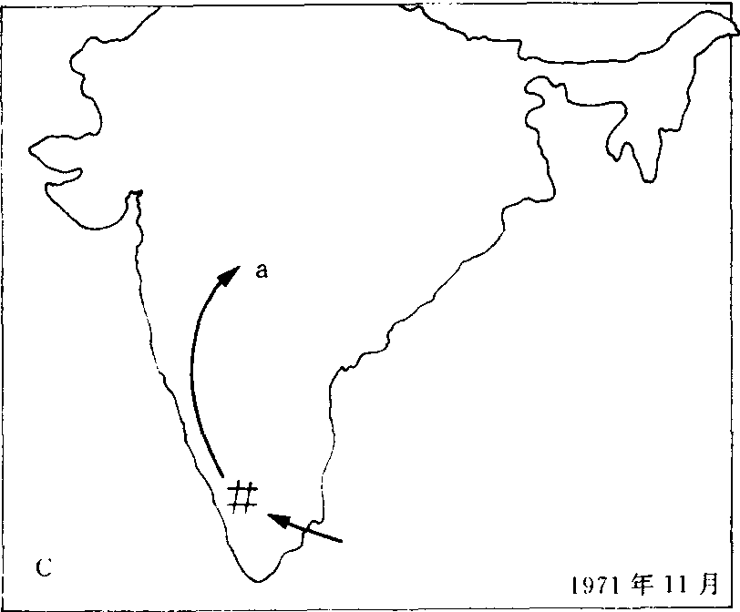 图2 印度南部小麦秆锈病远程传播示意图 A、B、C图示意在高山上越夏的秆锈菌在11月随掠过山区以弧线北移的气团,被远传至北方平原的过程。 #示尼尔吉瑞斯山;a示北方平原麦区 (据Nagarajan,1975,简化)