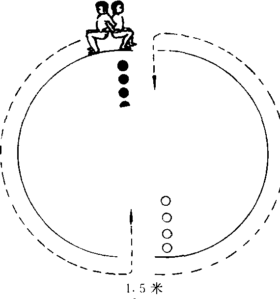 释义 | 连体跳接力 连体跳接力Lian ti tiao jieli适用于小学5—6年级。可以发展学生的下肢力量, 培养协调能力。 场地在空地上画一个大椭圆形, 中间留两个缺口,口宽1.5米。 游戏方法 把学生分成人数相等的两队,各成纵队形式站在椭圆形内。两队前2人背对背手臂相挎,两脚下蹲。教师发出开始口令后,2人协调用力沿半圆向前跳进,一直到对面缺口处进圈。这时本队第二组学生开始起跳前进,按上述方法进行。最后以各队末尾一组先跳进对面缺口处为胜。 游戏规则 ❶蹲跳前进时,不能站起行进。 ❷第一对必须进入对面圈内, 第二对才能起跳前进。 ☚ 跳篱笆 开火车赛跑 ☛ |