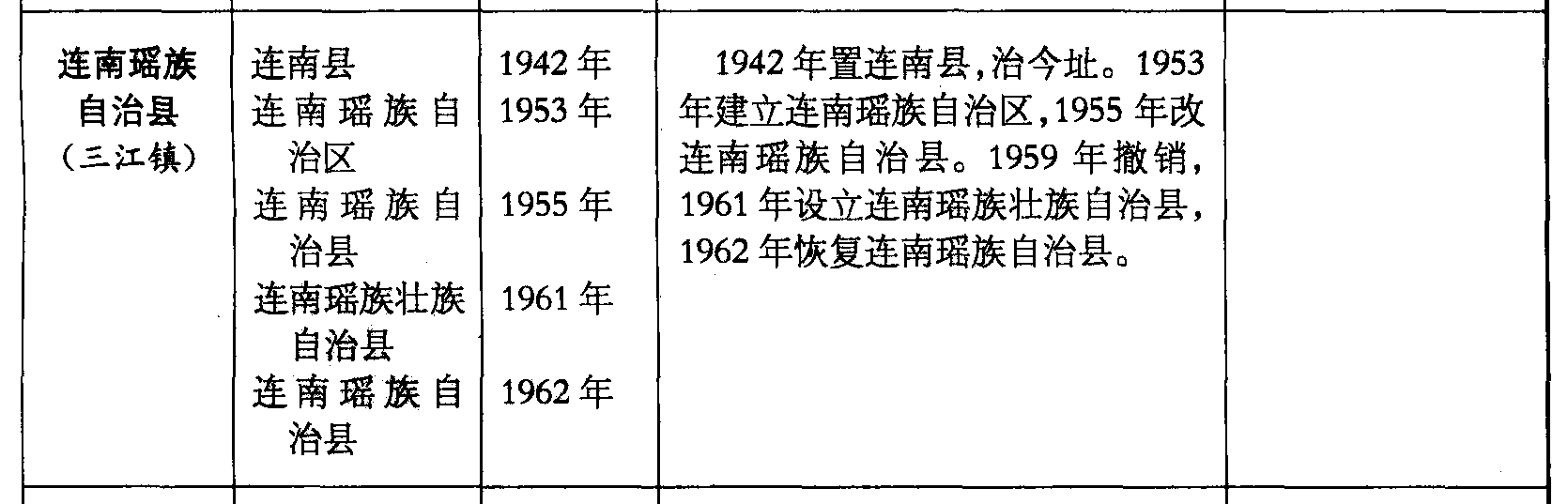 连南瑶族自治县(三江镇)连南县连南瑶族自治区连南瑶族自治县连南瑶族壮族自治县连南瑶族自治县1942年1953年1955年1961年1962年1942年置连南县,治今址。1953年建立连南瑶族自治区,1955年改连南瑶族自治县。1959年撤销,1961年设立连南瑶族壮族自治县,1962年恢复连南瑶族自治县。