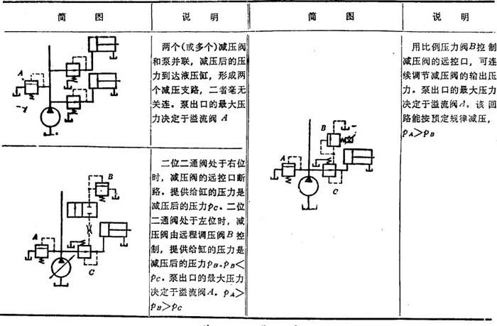 减压回路见表7.8-2。其功能是从调定压力的液压源获得一级或几级较低的工作压力。选用减压回路,应考虑所需低压的级数及在控制方面的要求。由于减压口处有功率损失,故减压回路不宜用在压降大、流量大的场合。