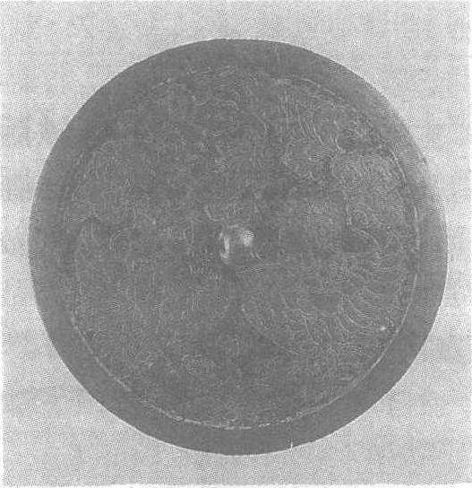 辽。直径23.8厘米。1956年辽宁省建平县张家营子辽墓出土。辽宁省博物馆藏。“迦陵频伽”又作歌罗频伽、加兰伽、羯罗频迦、羯脾伽罗等,鸟名。译意如声和雅。正法念经曰:“山谷旷野,多有迦陵频伽,出妙声音,若天若人,系那罗等无能及者。”铜镜圆形,镜面微凸,背面中央有半球形素钮,外铸凸线迦陵频伽纹,即莲花之上饰两人首鸟身,手捧宝物相向张翅而飞,其头戴莲冠。上下周边填有瑞云、花叶纹,空隙填黑漆为地。边宽平,略向上卷。铜镜纹饰流畅、铸工精细,局部加錾刻,有精细的削铸痕迹。铜镜以迦陵频伽为图,反映了佛教在辽代影响的深远。