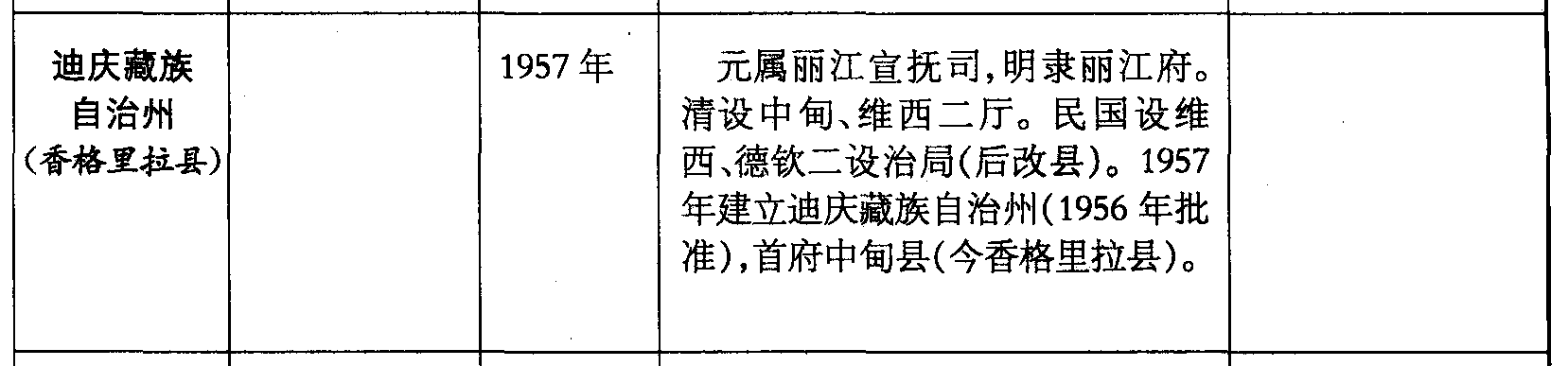 迪庆藏族自治州(香格里拉县)1957年元属丽江宣抚司,明隶丽江府。清设中甸、维西二厅。民国设维西、德钦二设治局(后改县)。1957年建立迪庆藏族自治州(1956年批准),首府中甸县(今香格里拉县)。