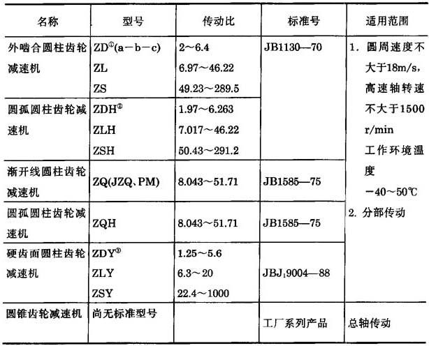 表11-8-26 齿轮减速机型号及适用范围 注: ❷ H——圆弧齿 ❸ Y——硬齿面 ❶ 表所列硬齿面减速机实际承载能力比软齿面高3倍,单级传动效率98%,两级96%,三级94%,这种减速机,可按机械强度公称功率的1/3~1/2选用,可查阅江苏省扬州轻工机械厂产品样本。 ❷ 表所列圆锥齿轮减速机,是造纸机械厂系列产品,可根据实际需要订制,或另行设计。 ❸ 表所列一般标准减速机可查阅机械设计手册。 |