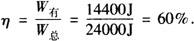 1.有用功(W有用) 利用机械做功时,对人们有用的功. 2.额外功(W额) 对人们无用但又不得不做的功. 3.总功(W总) 有用的功和额外功的总和.即W总=W有用+W额. 注意 1.使用任何机械都必然要做额外功所以由 可知,任何机械的效率总是小于1的. 2.机械效率体现了机械性能的优劣,机械效率越高,有用功在总功所占的比例就越大 3.区分功率和机械效率两个物理量.功率是用来表示机械做功快慢的;机械效率是用来衡量机械优劣的一个指标,功率越大并不说明机械的效率就越高,只能说明机械做功越快. 4.公式 ,也可表示为 ;对滑轮组可表示为 (式中G物为被提升物体所受的重力;n为承担动滑轮的绳子段数;F为对绳自由端施加的拉力). 5.一般情况下,人对机械所做的功都是总功. 6.提高机械效率的途径:(1)减小额外功在总功中占的比例.可采取改进机械的结构、减小摩擦阻力等方法.(2)增加有用功在总功中所占的比例. 例 一台起重机将重3600N的货物提高4m,如果额外功是9600J,起重机做的有用功是多少?总功是多少?机械效率是多少?起重机在哪些方面消耗了额外功? 解 起重机提升重物所用的力等于物体所受的重力 F=mg. 起重机提升重物所做的有用功 W有=Fh=mgh=3600N×4m =14400J. 总功W总=W有+W额 =14400J+9600J =24000J. 起重机的机械效率  起重机提升装货物的容器所做的功,各部件之间的摩擦做的功都是额外功. |