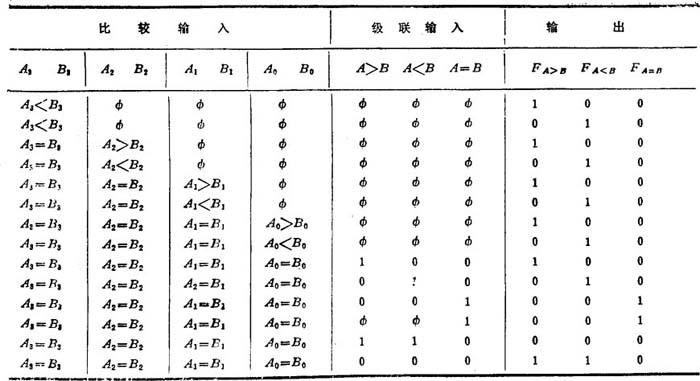 常用的组合逻辑部件有译码器、编码器、全加器和数字比较器等。 由输出的状态来表示输入代码的逻辑组合的数字电路,称为译码器,也叫解码器。根据其功能特点,可分成通用译码器及显示译码器两大类。国产通用译码器系列及其功能表(真值表)见表8.3-35和8.3-36。国产显示译码器系列及七段字形显示译码驱动器功能表见表8.3-37和8.3-38。 表8.3-35 国产通用译码器系列品种 全加器逻辑符号如图8.3-50所示。它是被加数、加数以及低位的进位三者相加,故有三个输入端、两个输出端。设输入中的an为被加数、bn为加数、Cn-1为低位向本位的进位,输出中的Sn为本位和、Cn为本位向高位的进位,根据全加规则,则可写出全加逻辑状态表,见表8.3-41。根据逻辑状态表可分别写出输出端Sn和Cn的逻辑表达式为: 表8.3-41 全加器逻辑状态表 表8.3-44 多位数值比较器某一位的逻辑功能 表8.3-45 T1085、T3085、T4085功能表  |