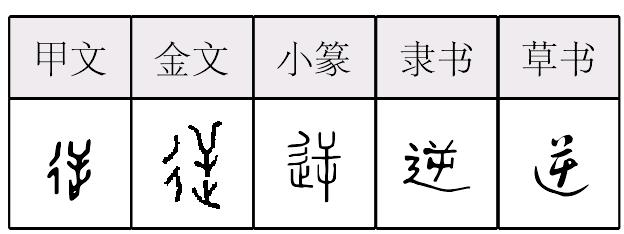 【提示】辶,3画,上面一点;旧字形4画,上面两点。辶的第二笔,宋体是横折,楷体是横折折撇。 *逆nì9画 辶部 (1) 〈书〉 迎接(与“送”相对): ~女|~之于途。 (2) 反方向活动: ~风|~流|~反心理|~来顺受。 (3) 抵触;违背;背叛(与“顺”相对): 忠言~耳|顺我者昌,~我者亡|叛~|乱~。 (4) 预先: ~料|~见。 逆 ☚ 迅 迎 ☛ 逆nì甲骨文,金文和小篆有屰字。就是“大”字倒写,象倒立人形。就是逆的本字。不顺义。后加彳旁,表示在路旁;再加止旁,即从辵(chuò),象人逆行。隶楷多如此。引申为方向相反。如:逆风|逆水行舟。又引申为抵触,不顺从。如:忠言逆耳。又为背叛者或背叛者的。如:逆产。又有近于相反意义的,迎接。引申为预先。如:逆料。 逆★常◎常