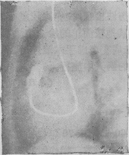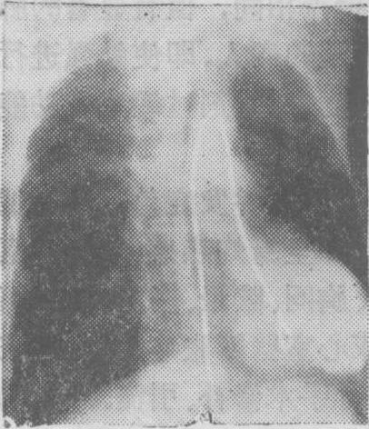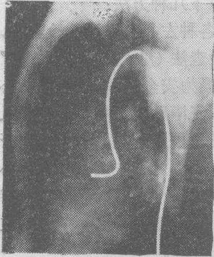 (2) 选择性左心室和主动脉造影: 选择性左心室造影可通过经胸壁穿刺左心室法、穿刺心房间隔左心导管检查法或经动脉逆行左心导管检查法(见“左心导管检查” 条) 等来施行。其中以后者最为安全可靠,并可同时施行选择性主动脉造影,尤以经皮肤穿刺股动脉法送入猪尾状左心室造影心导管最为简便(图3)。 术前准备除需作碘造影剂的过敏试验外,与经动脉逆行左心导管检查同。如从上肢动脉或颈外动脉送入心导管则以选用右侧较易送到升主动脉,如从下肢动脉送入心导管则选用左、右两侧股动脉均可。心导管顶端进入升主动脉后有时通过主动脉瓣有困难,此时顶端一段弯成圆圈状的心导管例如猪尾状心导管则较易送入。猪尾状心导管一般通过经皮股动脉穿刺法送入,当其套在导引钢丝外时,其顶端弯成圆圈部分即变直,便于经动脉穿刺口进入,撤出导引钢丝则顶端恢复圆圈状。当顶端经过主动脉瓣进入左心室有困难时,还可将导引钢丝再置入其管腔,但不到达顶端圆圈状部分,这样心导管的硬度加强而顶端仍呈圆圈状,更易于送入左心室。注射造影剂时心导管顶端的位置宜游离在心室腔中,并离二尖瓣较远,以避免造影剂注入心肌发生危险或反流入左心房,人为地造成二尖瓣关闭不全的假象。摄片取右或左前斜位投照。