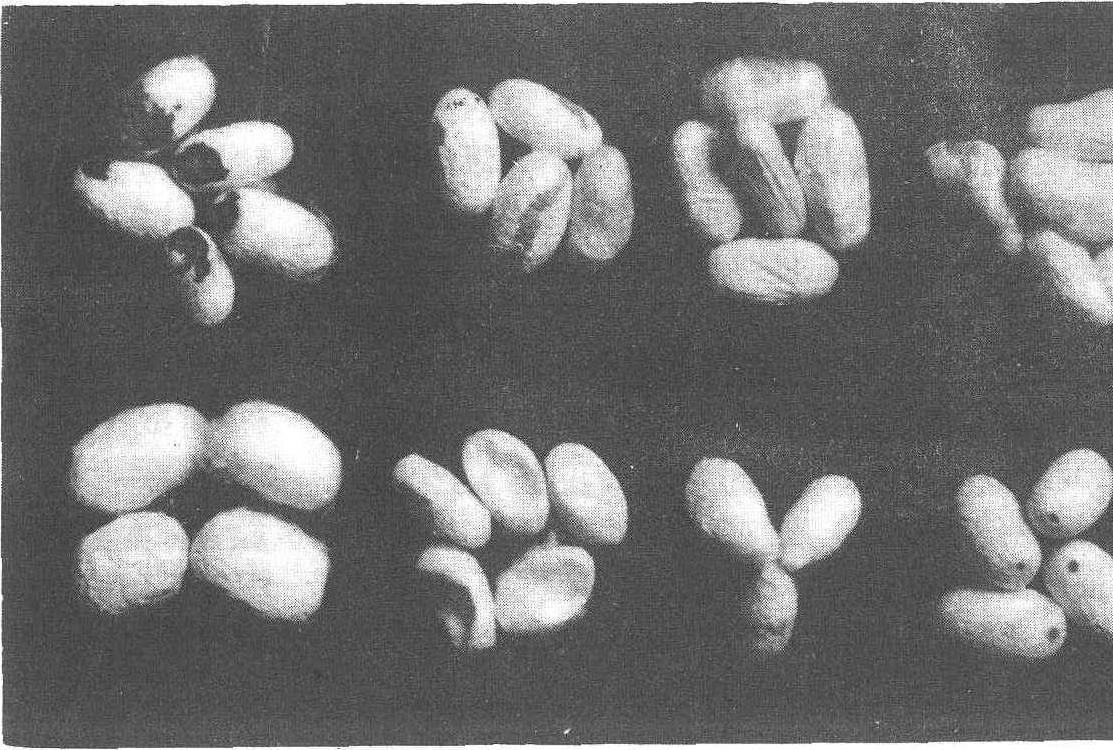 薄皮茧 茧层极薄,茧层重量不到同样号平均茧层重量的1/3。 软绵茧,蚕吐丝结茧中,遇到高温干燥,茧丝间胶着力弱小,茧层松浮,缩皱模糊,手触软绵感。 畸形茧 茧形特畸多角或严重的尖头茧。 油污茧 茧油污的总面积超过0.2平方厘米,或油污较淡但总面积超过0.5平方厘米。 穿头茧 蚕茧被多化性蝇蛆钻出茧层呈一小孔,或被蚕茧害虫咬穿。 薄头茧 茧层头部薄,光线反射暗淡。 压瘪茧 茧层一侧压瘪或沾有污物或蛹油;或二侧压瘪。 霉茧 茧层表面霉变,总面积超过0.5平方厘米。 特小茧 粒茧重量不到同样号平均粒茧重量1/3。 以上13项茧均为下茧标准,凡有疵点但程度不到下茧标准的茧,均作为次茧。 在选茧中有时为了立缫在定粒条件下,遇到生丝纤度在规定范围稍靠粗时可适当筛去少量大型茧,反之如稍靠细时可适当筛去少量小型茧,使其符合生丝目的纤度要求。分型时一般采用筛茧机,有滚筒式和平面式2种,筛茧隔距范围,根据茧型大小可分为16、18、20毫米等数种,当筛笼旋转或往返运转时,可分别筛出小型茧或大型茧。 选茧cocoon sorting根据制丝工艺要求,对原料茧进行选别分类的工艺过程。一般把茧分为上、次、下3类。上茧:茧形正常,茧色洁白,茧层厚薄均匀,无明显疵点,可缫制优质生丝的茧。次茧:有疵点,但程度不到下茧标准,可以缫次等丝的茧,如轻柴印、轻黄斑、轻油印、轻畸形、硬薄皮、硬绵、轻内印、有色茧等。下茧:又称下脚茧。不能或很难缫丝的茧,如穿头、双宫(可缫制双宫丝)、柴印、黄斑、油印、内印、薄皮、畸形、烂茧、软绵茧等。 选茧按工艺要求对原料茧进行分类选别的工序。依缫丝的规格质量要求,一般按茧形大小、茧层厚薄和茧的色泽等进行选别。 选茧sorting out defective cocoons |