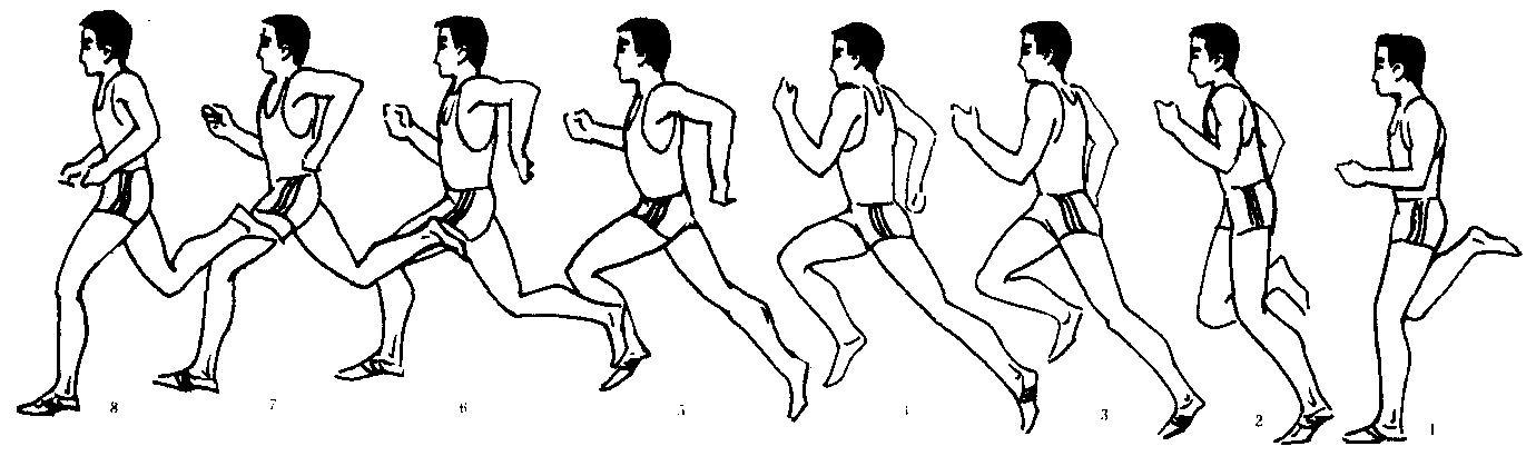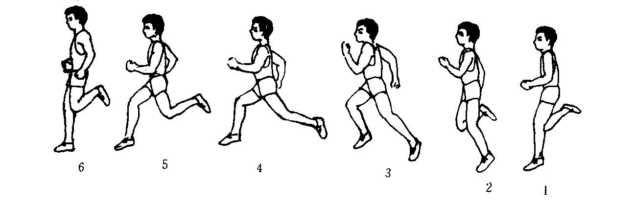 ❶腿摆动至最高点时,大腿积极下压,膝关节放松,小腿顺惯性前伸,接着前脚掌在身体重心投影点前约30厘米处迅速而有弹性地扒地。当身体重心移过支撑点垂直面时,迅速后蹬,并依次伸展髋、膝、踝关节。后蹬角度约50°。