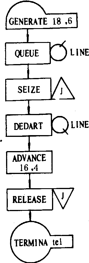 在不同的模拟系统中,动态实体有不同的定义和内涵,它可以是理发店的顾客、待入库的物资或通讯系统中的信号等。模拟的动态实体在GENERATE程序块产生开始后,便在流程图中按顺序移动或转移,直到通过TER-MINATE程序块终止结束。模拟顾客(动态实体)接受服务(占用服务台)时,按规定顺序进行。常用的排队规则是FIFO(先进先出)、LIFO(后进先出)和随机服务。为此>GPSS中设置了一个时钟,刻度为整数,单位是隐含的,模型中所有时间都用同一个时间单位。上图为一线一服务台的排队系统GPSS模型。 GPSS模型 根据这一GPSS模型,可直接写出模型的GPSS程序: