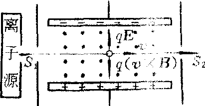 根据带电粒子在电场和磁场中偏转的原理,选择具有所需速度的粒子的装置。如图示,由离子源发射出的电子或离子其速度并不一致,这些带电粒子经小孔S1进入匀强电场E中,(E竖直向上与v垂直)。在电场中同时再加入一个方向垂直纸面指向读者的匀强磁场B。设带电粒子所带电量为q,已知洛伦兹力F=q(E+v×B),这里,qE与q(v×B)均沿竖直方向但取向相反,v×B的大小为vB,故F=q(E-vB),仅当F=0时,粒子才沿S1S2直线从小孔穿出,即只有满足条件v=E/B的粒子才能无偏转地经过S1S2后从小孔S2穿出,可通过改变E或B的数值来取得所需速度的粒子。速度选择器有重要的用途。例如在质谱仪中,从离子源中产生的正离子有不同的速度,必须用选择器把具有一定速度的离子选择出来,然后进入磁场,作匀速圆周运动。