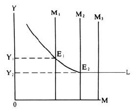 由于流动偏好的作用,利息率降低到一定限度后,无论货币如何增加,利息率也不会再下降了。如图,纵轴Y代表利息率,横轴M代表货币供给量,L为流动性偏好曲线,当货币供给量为M1时,与L相交于E1,利息率为Y1,货币供给量增到M2时,与L相交于E2,利息率降低为Y2,表明利息率随货币供给量的增加而下降。