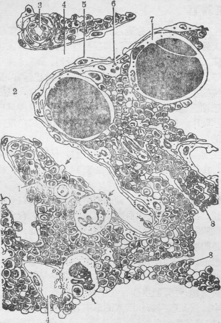 释义 | 造血器官haemopoietic organ昆虫体内不断分化并释放血细胞的囊状构造。通常位于附肢基部或成虫器官芽附近。周围有结缔组织膜包被,膜囊内有相互交织的类胶原纤维和网状细胞。在造血过程中,由网状细胞分裂、分化出干细胞后,再进行多次有丝分裂,最后分化成不同类型的血细胞群,释放进入血淋巴,以补充血细胞。网状细胞还具有活跃的吞噬功能,又称吞噬器官。 造血器官blood forming organ系指产生血液细胞及血小板等的组织器官而言。人类的造血器官在胎儿期主要为肝、脾、淋巴结,出生后肝、脾停止造血功能,但肝脏为血浆蛋白,包括纤维蛋白原均由肝脏产生,而造血器官主要为骨髓和淋巴结,其中骨髓中的红髓是造血的主要场所,各种红、白细胞及血小板均由此处产生,淋巴细胞由淋巴结产生,在病理情况下肝脏亦可少量造血。造血系统的各种疾病均与造血器官功能有关。 造血器官 造血器官产生血细胞的器官称造血器官。胚胎期的造血部位曾有几次转换,最初是卵黄囊,其后相继是肝、脾、胸腺和骨髓。广义而言,出生后的造血器官有骨髓、胸腺、脾和淋巴结等。但通常将胸腺、脾和淋巴结归为淋巴器官,是免疫系统的主要组成部分。胸腺是中枢淋巴器官,只发生T淋巴细胞(参见“胸腺”条)。脾和淋巴结为周围淋巴器官,是T、B淋巴细胞受抗原刺激后增殖和生成免疫效应细胞的部位(参见“脾”条和“淋巴结”条)。出生后的造血器官主要是骨髓,它产生多种血细胞。骨髓容纳在骨髓腔中,由造血组织和丰富的血窦组成,约占体重的4~6%,其总体积与肝相近。 红骨髓结构模式图 1.幼红细胞岛 2.中央纵行静脉 3.小动脉 4.血窦 5.内皮 6.周细胞 7.脂肪细胞 8.造血组织箭头示血细胞穿过内皮间隙进入血流 造血微环境不仅包括红骨髓中的网状组织,还包括血窦、毛细血管、微动、静脉以及伴行的神经纤维,它们参与调节微环境中的氧含量、酸碱度、物质代谢、造血因子,并调节血细胞的出入。有实验显示,同系小鼠的骨髓造血干细胞只能在骨髓和脾“落户”发育;同样的骨髓造血干细胞悬液在不同造血器官中生成的各系血细胞的比例不等。在骨髓,粒细胞系生成的比例高;在脾脏,红细胞系的比例高。造血干细胞多位于网状细胞的胞质凹陷内进行增殖和自我更新。新生的造血干细胞一旦离开网状细胞凹陷,就迅速分化,定向发育。在红细胞发生中,造血干细胞先在造血微环境作用下分化成红系祖细胞,再接受红细胞生成素的刺激,进一步增殖分化。若造血微环境有严重缺陷,即使有足够量的造血干细胞,仍会出现造血障碍。造血干细胞的分化是否只由造血微环境决定,尚见解不一。 造血组织中,血细胞的分布颇有规律。巨核细胞常紧靠血窦内皮间隙处,便于释放血小板入血。幼稚红细胞常位于血窦附近,成群地贴附在网状细胞表面,构成幼红细胞岛(见图),随着发育和成熟,逐渐靠近血窦壁。幼稚粒细胞多远离血窦,当发育至晚幼粒细胞具有运动能力时,主动地向血窦移动。 血细胞在造血组织中发育至成熟或接近成熟时穿过窦壁进入血循环。偶见有些血窦腔充满幼稚血细胞,提示可能有少数血细胞是在血窦内发育成熟。近年证实,外周血循环中含有极少量的造血干细胞。一般认为,血细胞是穿过内皮细胞的间隙入血的。造血活跃时,局部堆积大量成熟血细胞,挤压窦壁,使窦壁更薄或不完整,便于血细胞穿过。粒细胞借助变形运动钻过内皮。晚幼红细胞穿过内皮时失去胞核,成为网织红细胞,进入窦腔(见图)。巨核细胞经内皮间隙将血小板排入窦腔。有人观察到,血细胞也可直接穿透内皮细胞的胞质,进入窦腔。 骨髓的血管和神经 骨髓的动、静脉以多种方式和途径进出骨髓,因动物的种属、骨胳的类型及部位而异。例如,长骨有从骨干进入的营养动脉,从骨骺进入的骺动脉和干骺端动脉; 扁骨和不规则骨的红骨髓由营养动脉和骨膜动脉供应。营养动脉从骨滋养孔穿过骨组织进入骨髓后,分成升支和降支沿骨干长轴朝相反方向螺旋状走行,称中央纵行动脉。升、降支在长骨两端与骺动脉的分支吻合。以中央纵行动脉为轴,向骨松质的骨髓腔呈辐射状发出许多小分支,在造血组织附近再分成动脉毛细血管,通连血窦。还有些小动脉先进入骨组织营养骨,可再回到骨髓,通入血窦。血窦彼此通连,多以辐射状向心走行,汇入中央纵行静脉。后者多与同名动脉伴行。根据对兔股骨活体显微解剖观察,红骨髓动脉毛细血管与血窦相连,血循环是封闭的。黄骨髓小动脉的分支成为毛细血管,不形成血窦。骨髓的神经为无髓神经纤维,分布在造血组织和血管壁上。红骨髓有无淋巴管,尚无定论。 红骨髓的功能 主要是造血。成人的红细胞、粒细胞、单核细胞、血小板、B淋巴细胞和NK细胞等均在红骨髓发生。成人骨髓每天(按体重计)产生红细胞约1011/kg,粒细胞约1.6×109/kg,还储备一定数量的造血干细胞和各系造血祖细胞,保持着造血潜能。红骨髓也有防御免疫功能。它含有丰富的单核细胞和巨噬细胞,积极参与吞噬清除病菌、异物及衰老伤亡的血细胞。巨噬细胞能吞噬红细胞碎块,将其消化分解,把从血红蛋白分解出的铁储存,供重新利用。红骨髓是人类B淋巴细胞和NK细胞的发生部位,并向胸腺提供造血祖细胞以发生T淋巴细胞(参见“淋巴细胞发生”条及“胸腺”条)。T、B、NK淋巴细胞分别行使