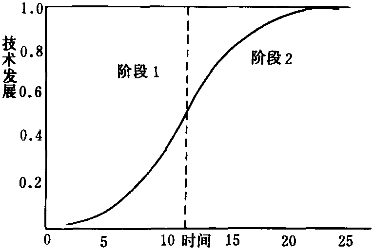 逻辑斯谛曲线 逻辑斯谛曲线Logistic Curve描述技术扩散程度的一种曲线。曲线呈S形。其轨迹的第Ⅰ阶段,曲线呈指数增长状态;第Ⅱ阶段,曲线反转趋于曲线的渐近线(见图)。该曲线可应用于研究技术扩散速度的“传染模型”中。在技术创新的扩散中,其扩散的是有关创新本身的信息。在某项创新尚未被广泛采用之前,非创新厂商对于该项创新的信息知之甚少,因此,采用该创新风险很大,随着越来越多的厂商采用创新,潜在采用者所获信息不断增加,采用该创新的有关风险相应减少,该创新扩散不断加快。但随着采用者的增加,潜在采用者的数目就会减少,因此,扩散速度会不断衰减直至终止。因此,曲线呈S形。这与R·弗农(R.Vernon)的产品生命周期的演化也是完全吻合的。运用该曲线进行研究的开拓性工作是Z·格里利切斯(Z.Griliches)于1957年发表的《杂交玉米:技术变化的经济探讨》一文;1969年曼斯菲尔德(E.Mansfield)在其《工业研究与技术创新:经济分析》一书中将该曲线完整化(见下图)。