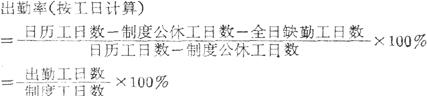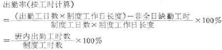 释义 | 出勤率 “缺勤率”的对称。 指某一时期职工的实际出勤工日(工时)数在制度规定应出勤工日(工时)数中所占的比重。用百分数表示。反映职工在国家(或企业)规定工作时间内出勤情况的指标。 计算公式为: 按工日计算: 按工时计算 按工日计算的出勤率的高低,取决于全日缺勤工日数的多少。 按工时计算的出勤率不仅受全日缺勤工日数多少的影响,还受非全日缺勤工时多少的影响,它所反映的出勤情况要比按工日计算的更全面、更完整。 出勤只是指职工上班。 因公出差也应作为出勤。 出勤率和缺勤率是两个对应的指标,两者关系为: 1-出勤率=缺勤率 |