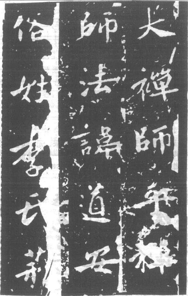 释义 | 道安禪師碑唐·開元十五年 (727) 刻。宋儋撰并書。行書二十八行,行字數無考。額隸書題“唐嵩山故道安禪師碑”九字。宋儋字學魏鍾繇,頗得其意,時稱名手。此碑體兼行、楷,多用侧筆,畫略扁平而有骨力,筆势率直而淡雅,别出門庭,古意猶存,為斯時露頭角之名碑。清葉昌熾《語石》曰:“儋書纯用侧筆,誠非正宗。然筆法的真從〈根法師碑〉出。徐季海 (浩)書肉餘骨,儋書書骨餘肉,二者不可兼得,寧舍彼而取此也。”碑在明萬曆間 (1573——20) 為雷火所擊,斷成兩截。下截已漶漫,模糊不得識。其未斷舊拓本尚存數百字。碑今在河南嵩山會善寺。 道安禪師碑 (局部) |