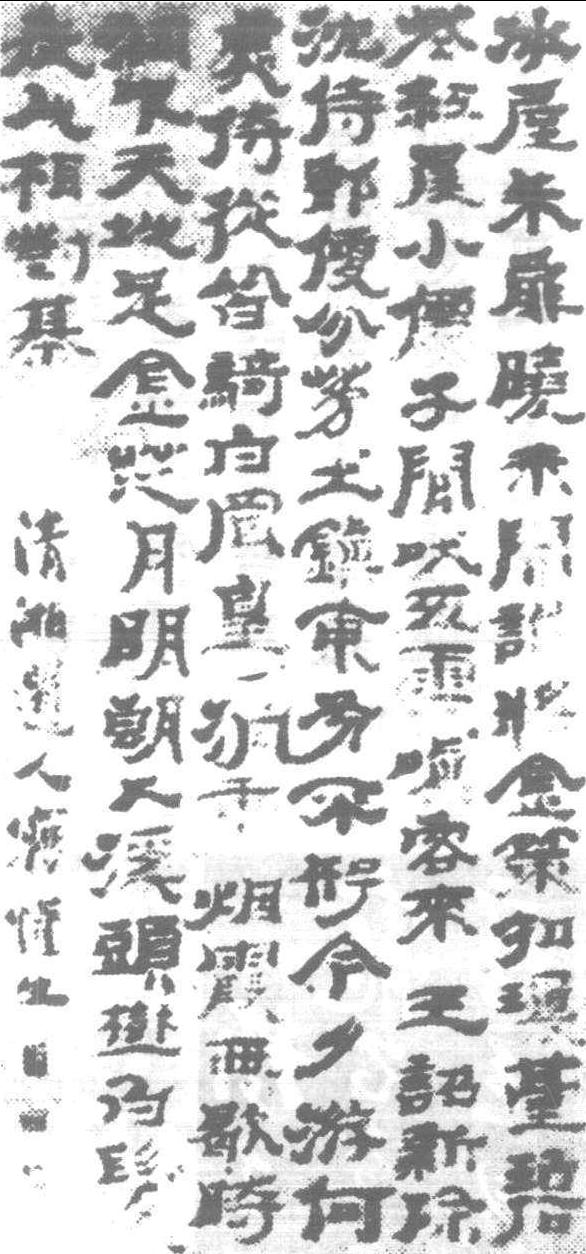 道濟七絶 (局部) (明·崇禎三年——清·康熙四十六年,1630~1707)廣西桂林人。俗姓朱氏,一名原濟,號大滌子,又號小乘客,别署支下人、支下陳、半箇漢、石濤、向年、老濤、竹冠道士、阿長、若極、苦瓜和尚、清湘老人、清湘石道人、莫書和尚、湘源、無髮人、鈍根、粤西濟山僧、靖江後人、零丁老人、膏盲子、瞎尊者、濟山僧、濟道人、元濟。明宗室。與八大山人 (朱耷)同時。明亡,逃世為僧,拜松江名僧旅庵、本月為師,傳受佛學。工詩文,善山水、蘭竹、花果,兼能人物,筆意縱恣,脱盡窠臼,王原祁謂為 “大江以南,當推石濤為第一”。通書法,尤精分隸。《桐陰論畫》曰:“石濤尤精分隸書,王太常云 ‘大江之南,無出石師右者’,可謂推許之至。”包世臣《藝舟雙楫》評其行書 “逸品下”。著有《苦瓜和尚畫語録》、《清湘老人題記》、《大滌子題畫詩跋》。 |