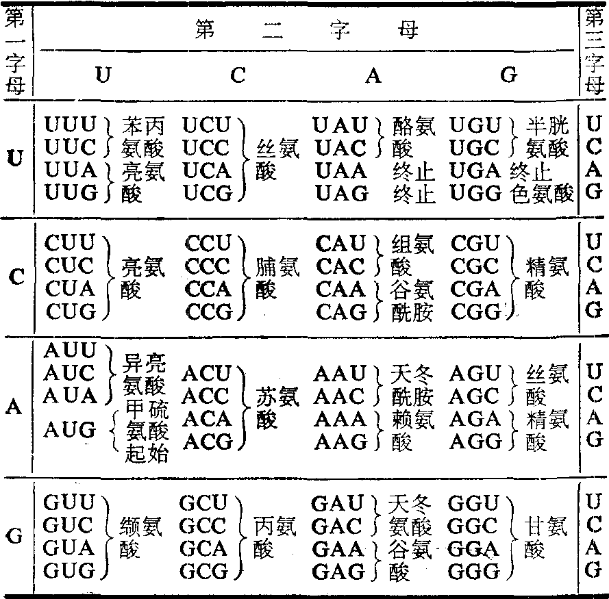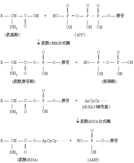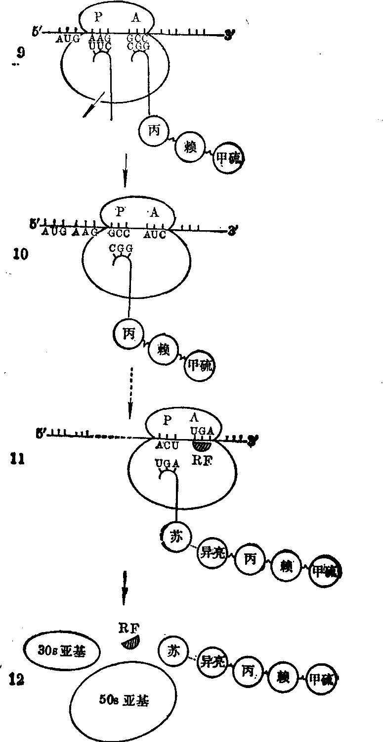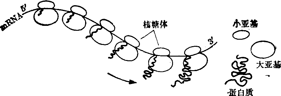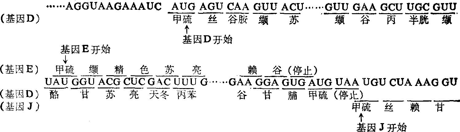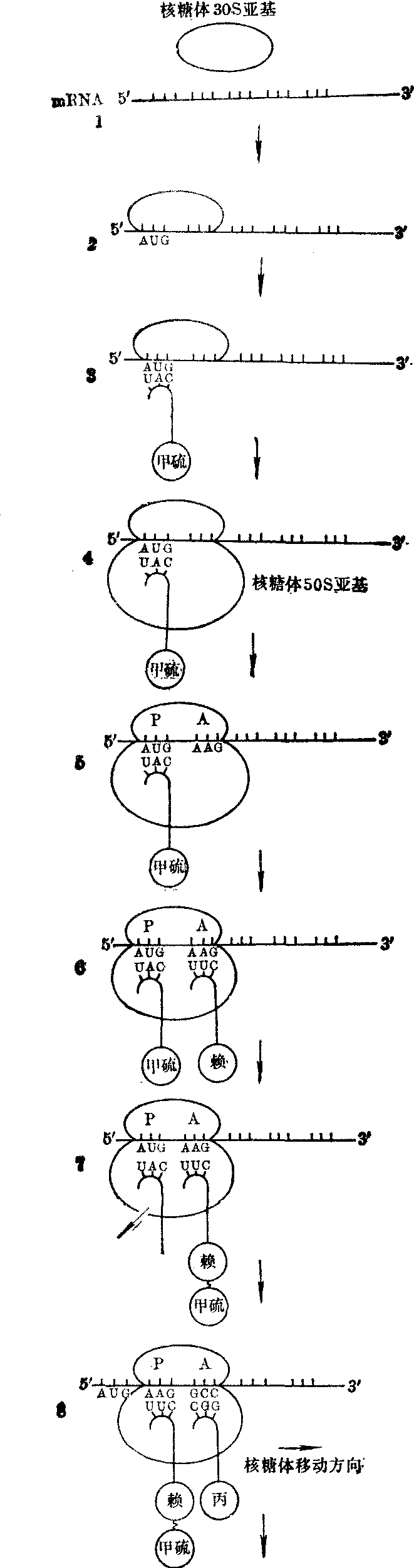 释义 | 遗传信息的转译 遗传信息的转译基因的遗传信息从特定DNA的核苷酸顺序翻译成相应多肽链的氨基酸顺序,这过程称为转译。基因的遗传信息一般是通过蛋白质的一定结构和生理生化特性表现出来的。蛋白质一般由20种氨基酸以不同的种类、数量、排列组合而成。蛋白质不能直接从核酸分子上以转录的方式合成,因此需要从核酸“文字”翻译成蛋白质“文字”,这样才能将遗传信息准确地表达出来。因此,某些碱基的组合和某一种氨基酸之间存在着对应关系。 遗 传 密 码 子 原核细胞的转译 mRNA碱基顺序转译成蛋白质的氨基酸顺序有两个主要步骤,第一步为氨基酸的激活和转运,第二步为mRNA的“解读”与蛋白质合成。 氨基酸的激活和转运: 转移RNA(tRNA)作为载体将相应的氨基酸转运到核糖体上。首先是氨基酸分子的活化,即它的羧基与三磷酸腺苷(ATP)反应,形成氨酰腺苷酸,被激活的氨基酸和相应的tRNA3′端的腺嘌呤残基结合,形成氨酰-tRNA。这个连续的反应,是在特异性氨酰tRNA合成酶催化下进行的(图1)。每一种氨酰合成酶具有两个结合部位: 一个部位能识别特定氨基酸的R基团;另一个部位能识别相应的tRNA,因而能促进特定氨基酸与相应的特定tRNA结合,形成氨酰-tRNA。 在起始转译时起决定作用的是甲酰甲硫氨酰-tRNA。它的形成过程是,甲硫氨酸与相应的tRNAmet结合,随后甲硫氨酸经过甲基化,形成甲酰甲硫酰-tRNArmet,即所谓起始tRNA。 “解读”与蛋白质合成 mRNA的“解读”是根据mRNA链碱基顺序中的密码子顺序去识别氨基酸顺序的过程。也就是基因所决定的蛋白质合成的过程。 (1) 蛋白质合成的开始:在原核细胞中,在三种蛋白质因子(起始因子)的作用下,核糖体的沉降系数为30S的亚基附着到mRNA上,这是依赖于16S rRNA的3′端的某2个顺序与mRNA起始密码子(AUG)之前的某两个顺序形成互补关系。然后,第一个被结合到起始密码子 图1 氨酰tRNA的形成 AUG上的是甲酰甲硫氨酰tRNA(甲酰-met-tRNA![]() (2) 多肽链的延长:tRNA“解读”mRNA上的遗传信息需要在核糖体准确位置上。70S核糖体有两个专门结合tRNA的部位: 一个是氨基酰部位(A位),是接受氨基酰tRNA以反密码子和A位上的mRNA的密码子相配合的部位;另一个是肽酰部位(P位),只能接受从A位转移的tRNA分子(起始tRNA例外,可直接进入P位)。多肽链的延长,首先是第二个氨酰tRNA同延长因子EF-Tu和GTP结合成复合物,后者再结合到70S核糖体的A位上,然后释出EF-Tu,GDP。第二步,在肽酰转移酶催化下,核糖体P位上的氨基酸以羧基端转向A位上的氨基酰tRNA的氨基上,形成肽键。这时P位脱掉氨基酸的tRNA便从核糖体上释放出来,进行下一次的循环。第三步核糖体沿mRNA 5′→3′方向移动一个密码子距离,使原在A位上的tRNA移至P位。mRNA下一个密码子定位在A位上,以接受第三个氨基酰tRNA。按上述过程周而复始,多肽链逐渐延长,直至遗传信息的末端。 (3) 多肽链的合成终止: 当核糖体移行至终止密码子UAA(或UAG、UGA)时,这些终止密码子被一种蛋白质释放因子(RF)所识别,RF阻止肽酰转移酶的作用,导致肽链终止。多肽被释放,核糖体分解成50S亚基和30S 图2 遗传信息的转译 以上所说的仅是一个核糖体参加转译的情况,在电子显微镜下可以看到一条被转译的mRNA分子上有2个甚至是20个核糖体串连起来循序地进行转译。称为多聚核糖体(图3)。 图3 多聚核糖体示意图 电子显微镜下还显示,在原核细胞转录开始后,随即进行转译,以后转录和转译同时进行。 真核生物的转译 在真核细胞里,转译也分为起始、延长和终止三步。其机理基本上与原核细胞相同,但在细节上却较复杂,而且往往随生物种和组织的不同而异,尚难归纳出一般规律。真核细胞的核糖体较大,沉降系数为80S,由两个亚单位组成: 小的为40S,含有18S RNA;大的为60S,含28S,5.8S和5S RNA。真核细胞的蛋白质因子,即起始因子,数目约为原核细咆的3倍多。起始复合物形成过程也比较复杂。有些mRNA 5端在mG-ppp帽后还有一个长约50个核苷酸的短碱基顺序,称为引子。帽和引子可能有助于指引核糖体寻找和识别mRNA有关顺序内的第一个起始密码子AUG,在那个部位形成起始复合物。有人认为,首先与mRNA5′端结合的是核糖体40S小亚单位;待核糖体沿着mRNA链按5′→3′端的方向前进到第一个起始密码子AUG时,核糖体的60S大亚单位便参加了起始复合物的组成,形成80S·met-tRNA·mRNA起始复合物。这是转译的第一步。以后蛋白质链的延长和合成终止,与原核细胞基本相同,只在延长因子以及终止时的释放因子的结构和功能上存在着一定的差异。 重叠基因的表达方式 φX174噬菌体DNA的顺序已经被测定出来,为5375个碱基组成,共有9个基因,基因按A-B-C-D-E-J-F-G-H顺序组成(图4)。从这个基因图可以看出: 基因编码顺序之间可以被非编码的间隔顺序隔开,如J-F-G-H-A之间;也可以不存在非编码间隔顺序,如基因A,C,D,E形成了连续的编码顺序,基因图还显示了,某一个小基因包含在其他的大基因之中,如基因B在基因A之中,基因E在基因D之中。虽然大小两个基因相重叠,但他们的读出范围是不同的(图5)。 图4 φX174基因组的基因图 图5 基因E和基因D的重叠 基因重叠现象说明:φX174这类的噬菌体DNA分子较小,要贮存9种蛋白质的信息,基因重叠是最经济的方式。 基因表达的调控 见“细菌代谢的遗传控制”和“内分泌与遗传”。 ☚ 遗传信息的转录 显性与隐性 ☛ |
