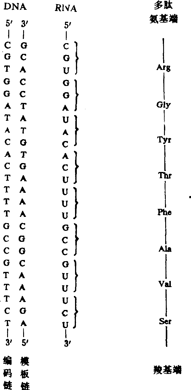 1961年美国学者尼伦伯格 (M. W. Nirenberg)等以人工合成的mRNA作模板,进行蛋白质的离体合成,随后再测定产生的多肽的氨基酸顺序。发现多聚U作为信使则合成多聚苯丙氨酸,多聚A作为信使则合成多聚赖氨酸; 多聚C产生多聚脯氨酸; 多聚G产生多聚甘氨酸等。说明苯丙氨酸、赖氨酸、脯氨酸、甘氨酸等的密码子分别是UUU、AAA、CCC、GGG等。美国学者柯拉纳(H.G.Khorana)用共聚的多核苷酸UGUGUGUG……作为信使则合成缬氨酸与半胱氨酸多聚体。以后确证缬氨酸的密码子是GUG,半胱氨酸的密码子是UGU。1964年开始,尼伦伯格等进而用64种人工合成的三核苷酸和氨基酸-tRNA(即与tRNA结合的活化氨基酸)、核糖体三者进行结合试验,证明各种三核苷酸具备信使作用。例如三核苷酸是UUU时只与苯丙氨酰-tRNA结合;AAA只与赖氨酰-tRNA结合,而二核苷酸无此作用。用这一方法最终揭示了64种密码子中61种密码子与20种氨基酸之间的对应关系,于1966年完成遗传密码表(表2)。5′端核苷酸、中间核苷酸,3′端核苷酸(或称第一碱基、第二碱基、第三碱基)依次组成一个密码子,此称三联体密码。表2中所列64个密码子中有61个编码18种氨基酸和2种酰胺。其他如胱氨酸、羟脯氨酸、羟赖氨酸等是在肽链合成后再行加工而成。还有3个不编码任何氨基酸只作为终止信号的密码子。密码子AUG既编码甲硫氨酸又有合成起始点的作用。 表2 遗传密码表 特性 ❶密码子相互之间没有 “逗号”,没有 “间隙”或“闲置”的核苷酸,即除了终止密码子外,各密码子之间没有任何不编码的核苷酸。从起始密码子(AUG)开始,沿mRNA多核苷酸链由5′到3′的方向进行转译,直至遇到终止信号UAA、UAG或UGA时便停止转译。 ❷密码子之间没有重叠性,即mRNA多核苷酸链上的任何两个相邻的密码子不会共有同一个核苷酸。如多核苷酸链是ACUGAUGUG,则这三个密码子分别编码苏氨酸、天冬氨酸、缬氨酸,不可能交叉重叠组合成三个以上的密码子,编码三个以上的氨基酸。 ❸简并性。大多数氨基酸可由2个以上密码子识别。例如赖氨酸有两个密码子、丙氨酸有四个密码子; 精氨酸、亮氨酸分别有六个密码子。识别同一氨基酸的密码子称同义密码,也称简密码。克里克认为三联体密码中第一、第二核苷酸的顺序是严格的,第三个可以变动为任何核苷酸,但仍决定同一氨基酸。简并现象对生物遗传性的稳定具有重要意义。密码子的简并性也反映在反密码子中,即反映在tRNA分子中,某些氨基酸能被一个以上的tRNA分子携带到mRNA特定位置上。识别同一氨基酸的不同tRNA称同功tRNA。 应用 查明决定各种蛋白质的遗传密码,就可人工合成有用的蛋白质分子直接应用于医疗和日常生活;并进而利用遗传工程手段在农业动植物生产与创新、医药卫生、工业生产、环境保护等方面造福人类。现已证明,从病毒到人类的遗传密码是通用的,故密码研究可作为进一步探索生命奥秘的手段。 遗传密码 遗传密码DNA链上每三个碱基(也即三个核苷酸)顺序,作为决定一个氨基酸的密码,叫遗传密码或称三联密码。人类的一切遗传性状,都是在发育过程中,经过一系列的新陈代谢而形成,是蛋白质活动的一种体现。也就是说,所有的代谢过程都是在酶蛋白质的控制下进行,并形成一定的遗传性状。已知遗传密码存在于细胞核的DNA中,而蛋白质的合成则是在细胞质中进行的,遗传密码是怎样指令合成蛋白质而表现出遗传性状的呢? DNA不直接决定蛋白质的合成,它是将DNA所携带的遗传信息先传递给mRNA(信使RNA),此过程叫转录。转录时,DNA的双链暂时脱开,其中的一条链起模板作用,按碱基互补进行碱基配对。mRNA在细胞核中合成后就转录上DNA遗传信息,通过核膜的核孔转入细胞质中附着于核蛋白体上,以其密码控制蛋白质的合成,此过程叫翻译。也就是说,密码中应用的是mRNA的核苷酸顺序,控制着蛋白质的合成。DNA含有四种碱基,在三个相邻位置上随机排列组合,可能的组合数有43=64种密码。一个密码可决定一种氨基酸,而氨基酸只有20种,所以往往有几个不同的密码决定同一种氨基酸。这些不同密码,可以称为同义密码。同义密码愈多,这种氨基酸的稳定性就愈大。对于只有一个密码的色氨酸来说,如三联密码中有一个碱基发生改变,则整个遗传信息就会改变,而使生物出现不同性状。而有六个密码的精氨酸就比较稳定。在64种密码中AUG是起始符号,三种密码UAA、UAG、UGA没有相应的氨基酸是终止符号。 ☚ DNA自我复制 遗传基本单位——基因 ☛ 遗传密码genetic code按核苷酸三联体顺序排列的64种密码子所决定的遗传信息。其中少数是无义密码子,部分是同义密码子。在指导蛋白质合成中,每个密码子可决定相对应氨基酸在多肽链上的位置,总的氨基酸序列决定于由遗传信息规定的遗传密码排列顺序。在以脱氧核糖核酸(DNA)作为遗传物质的生物,DNA双链分子中只有一条为有义链,可将遗传信息由DNA转录到信使核糖核酸(mRNA)上。通常遗传密码就用RNA,而不是用DNA中的核苷酸碱基排列顺序表示。具有以下性质: 遗传密码决定蛋白质各个氨基酸构成的核苷酸三联体顺序(密码子)。脱氧核糖核酸(DNA)分子上的遗传信息由腺嘌呤(A)、胸腺嘧啶(T)、鸟嘌呤(G)和胞嘧啶(C)4种核苷酸组成。mRNA的遗传信息从DNA双链中一条单链(编码链)转录而来,每3个核苷酸构成一个密码子。转运核糖核酸(tRNA)分子中有3个与mRNA的三