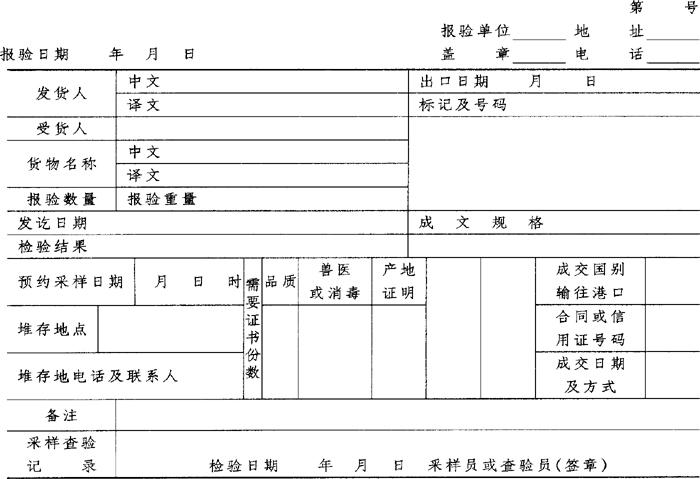 释义 | 出口检验申请单 【简介】: 出口商品凡属法定检验商品,根据国家规定,为了加强商品质量管理,出口前必须实行强制性检验。具体应检验品种见商检局颁布的“现行实施检验出进口商品种类表”,主要有大米、桐油、鸡蛋、蚕丝、粗纺、精纺羊毛织品、西服、衬衫(府绸、棉涤纶)、自行车等。出口时应填写“出口检验申请单”、随附合同、信用证。经工厂检验的商品,应随附厂检证。在外地已经产地商检局检验过的商品,一般应在报关前10天报验。报验合格,由商检局在报关单上加盖“验讫”图章,才能申报出口。 这种文书一般为表格式,有固定的格式。其体式、结构,详见下文“范例”部分所示。 【范例】: 出口检验申请单 出口检验申请单 |