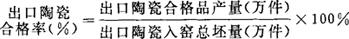 释义 | 出口陶瓷合格率 反映出口陶瓷合格品产量与出口陶瓷入窑总坯量的比率,用百分数表示。 出口陶瓷主要是指供出口用的各种陶瓷器皿、炻器及砂瓦土陶土瓷器皿等。不包括建筑、卫生、电气用的陶瓷器及工业陶瓷器。其计算公式为: 式中:出口陶瓷合格品产量包括已经出口、待出口、出口转内销的合格品产量。 |