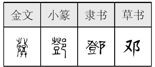 释义 | 邓读音d·eng(ˋ),为eng韵目,属ing—eng韵部。徒亘切,去,嶝韵。 上一条: 戥 下一条: 鄧 邓登děng逗弄。例:在身上胡 ![]() ![]() ![]() ![]() ![]() ![]() ![]() ![]() 邓鄧dèng姓。 邓dèng邓dèng姓。 邓dèng〖名词〗 邓*鄧dengB5CB 邓 邓古地名。春秋鲁地,在今汶河以南、运河以北地区(清兖州府境内)。《左传·隐公十年》:“公会齐侯,郑伯于中丘……盟于邓。”即指此。 ☚ 方舆考证 水泊梁山 ☛ 邓(鄧)dènɡⅠ ❶ (古国名) Deng,a state in the Zhou Dynasty 邓(1)国名。曼姓,西周初年即已存在。故城在今湖北襄樊市西北。一说在今河南邓县。春秋初年与楚通婚。楚武王夫人邓曼是当时对楚王颇有影响的才女。楚文王十二年(前678)灭于楚。(2)楚县名。楚灭邓后所置。近年所出邓公乘鼎,一般认为即是楚邓县县公所作。(3)春秋蔡地,后属楚。在今河南郾城东南。《左传》桓公二年“蔡侯、郑伯会于邓”,即此。 邓❶国名。西周。春秋时国,在今湖北襄樊市西北。前678年灭于楚。 邓古国名。曼姓。在今河南邓县一带。公元前678年为楚所灭。 邓*鄧dèng(4画) *邓(鄧)dèng4画 又部 姓。 邓鄧dèng商代和西周只作“登”,没有邑(阝)旁,假借字。春秋以后作“鄧”,形声字。从阝(邑),从登,登亦声。加邑旁只是分化字义,加强表示字义。是商、周国名,在今河南邓县,春秋时为楚国所灭,后作地名。商代以后也作姓用。“又”旁本有似草书写法,后群众就写作“又”旁,作“邓”。现作规范字。见《总表》。 邓鄧★繁◎常★常dènɡ鄧,形声,从邑,登声,本义为古国名,引申为姓。《简化字表》简作“邓”,音符用符号又代替。 |