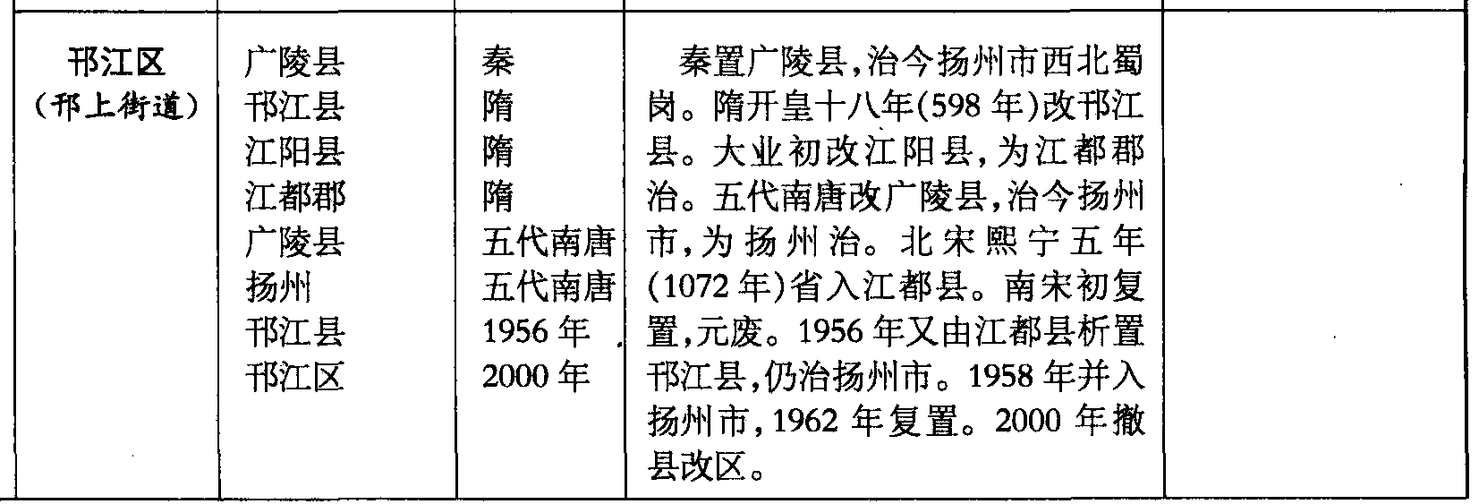 邗江区(邗上街道)广陵县邗江县江阳县江都郡广陵县扬州邗江县邗江区秦隋隋隋五代南唐五代南唐1956年2000年秦置广陵县,治今扬州市西北蜀岗。隋开皇十八年(598年)改邗江县。大业初改江阳县,为江都郡治。五代南唐改广陵县,治今扬州市,为扬州治。北宋熙宁五年(1072年)省入江都县。南宋初复置,元废。1956年又由江都县析置邗江县,仍治扬州市。1958年并入扬州市,1962年复置。2000年撤县改区。