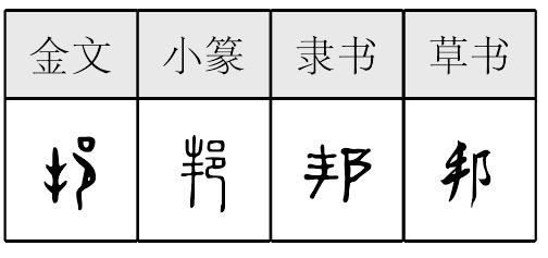 【提示】 , 起笔是横, 旧字形是撇; 中间一撇与三横相交,上面出头,不要错写成与第一笔相接、不出头的。阝, 2画, 起笔是横撇弯钩; 旧字形3画,起笔是横撇。 *邦bāng6画 邑部 国家: 邻~|~交。 邦 ☚ 邑 郡 ☛ 邦bāng上古形声兼会意字。从阝(邑),从(丰),丰亦声。 隶楷阝形在左是阜字的变形,在右是邑字的变形。声旁“丰”的韵母读ang,像工声的江字读jiāng。甲骨文“邦”本象田里种着植物,象有边界的土地,指古代的诸侯国,又有分封、封建之义,又指城邑、国家。今仍有国家义。如:友邦|盟邦|邦交。 邦★常◎常