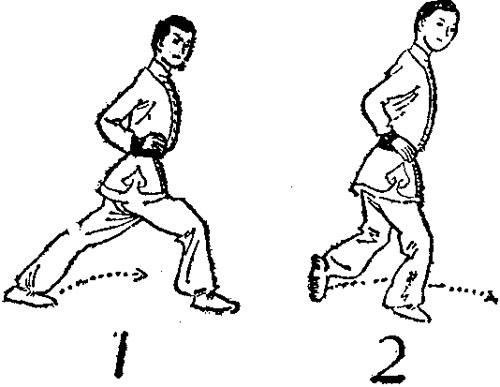 武术步法。前腿伸直,上身前倾,后腿离地提起,前脚蹬地前纵,在空中后脚从后向前碰击前脚,后脚先落地。