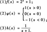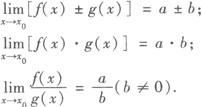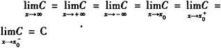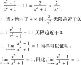 如果 a, ,那么  【说明】 在进行函数极限的运算时,还经常用到下面的结论: (1) (C是常数);  一个重要结论:  例1 讨论下列函数当x→+∞,x→—∞和x→∞时的极限.  解 根据函数f(x)当x→+∞,x→—∞,x→∞时极限的定义,观察函数值变化的趋势,结合函数图象得出的结论. (1)由下图可知, 不存在, , 不存在.  (2)由下图可知, , , 不存在.  (3)由图可知, 0,∴ .   当a,b取何值时, 存在,其值为多少? 解 x=0是此分段函数的分界点,而 存在的充要条件 与 都存在并且相等∴ . ∴当b=2,a取任意常数时, 存在,其值为2. 例3 研究函数 在x=0处的左、右极限. 解 由于x<0时, . 所以当x→0—时,f(x)→—1, 故 而当x>0时, , ∴当x→0+时,f(x)→1, 因此, . 由于 所以 不存在. 探索延拓创新 例4 求证: . 解 对照 的定义进行证明. 注意到当x>0时,有  |