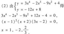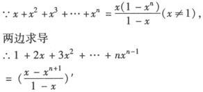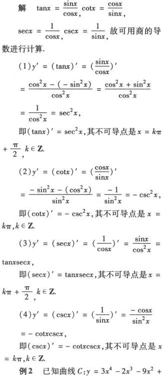 1.和(或差)的导数 法则1 两个函数的和(或差)的导数等于这两个函数的导数的和(或差),即(u±v)′=u′±v′. 2.积的导数 法则2 两个函数的积的导数等于第一个函数的导数乘以第二个函数,加上第一个函数乘以第二个函数的导数,即(uv)′=u′v+v′u. 3.商的导数 法则3 两个函数的商的导数,等于分子的导数与分母的积,减去分母的导数与分子的积,再除以分母的平方,即 . 例1 求下列函数的导数,并指出其不可导的点. (1)y=tanx;(2)y=cotx; (3)y=secx;(4)y=cscx.  4. (1)求曲线C上横坐标为1的点的切线方程; (2)第(1)小题中切线与曲线C是否还有其他公共点? 解 (1)把x=1代入C的方程,求得y=—4. ∴切点为(1,—4). ∵y′=12x3—6x2—18x, ∴切线斜率为k=12—6—18=—12. ∴切线方程为y+4=—12(x—1),即y=—12x+8.  代入y=3x4—2x3—9x2+4,求得y=—4,32,0,即公共点为(1,—4)(切点),(—2,32),(2/3,0). 除切点外,还有两个交点(—2,32),(2/3,0). 此例告诉我们:曲线与直线相切,并不一定只有一个公共点,当曲线是二次曲线时,我们知道直线与曲线相切,有且只有一个公共点,这种观点对一般曲线不一定正确. 例3 求和1+2x+3x2+…+nxn—1(x≠1). 解 由求导公式(xn)′=nxn—1,可联想到它是第一个和式x+x2+x3+…+xn的导数.   利用本题的结论和方法我们还可以求2+6x+12x3+…+n(n—1)xn—2的和,请读者自己完成. |