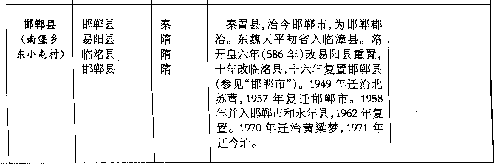 邯郸县(南堡乡东小屯村)邯郸县易阳县临洺县邯郸县秦隋隋隋秦置县,治今邯郸市,为邯郸郡治。东魏天平初省入临漳县。隋开皇六年(586年)改易阳县重置,十年改临洺县,十六年复置邯郸县(参见“邯郸市”)。1949年迁治北苏曹,1957年复迁邯郸市。1958年并入邯郸市和永年县,1962年复置。1970年迁治黄粱梦,1971年迁今址。