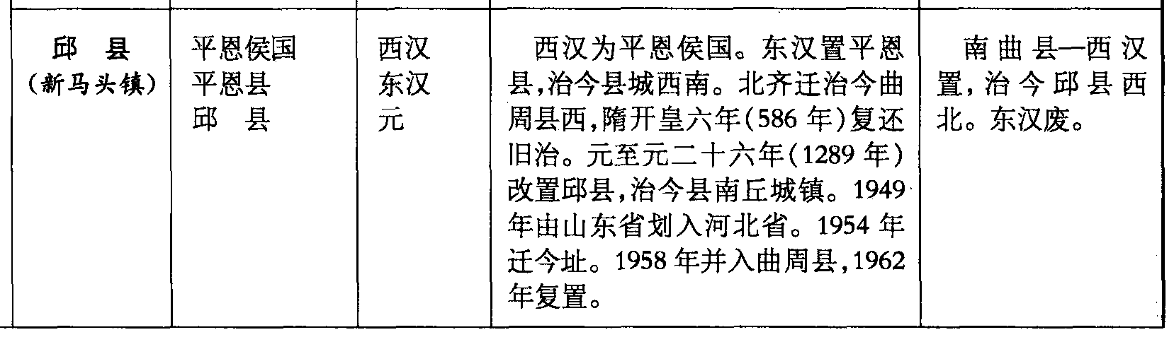 邱县(新马头镇)平恩侯国平恩县邱县西汉东汉元西汉为平恩侯国。东汉置平恩县,治今县城西南。北齐迁治今曲周县西,隋开皇六年(586年)复还旧治。元至元二十六年(1289年)改置邱县,治今县南丘城镇。1949年由山东省划入河北省。1954年迁今址。1958年并入曲周县,1962年复置。南曲县—西汉置,治今邱县西北。东汉废。
