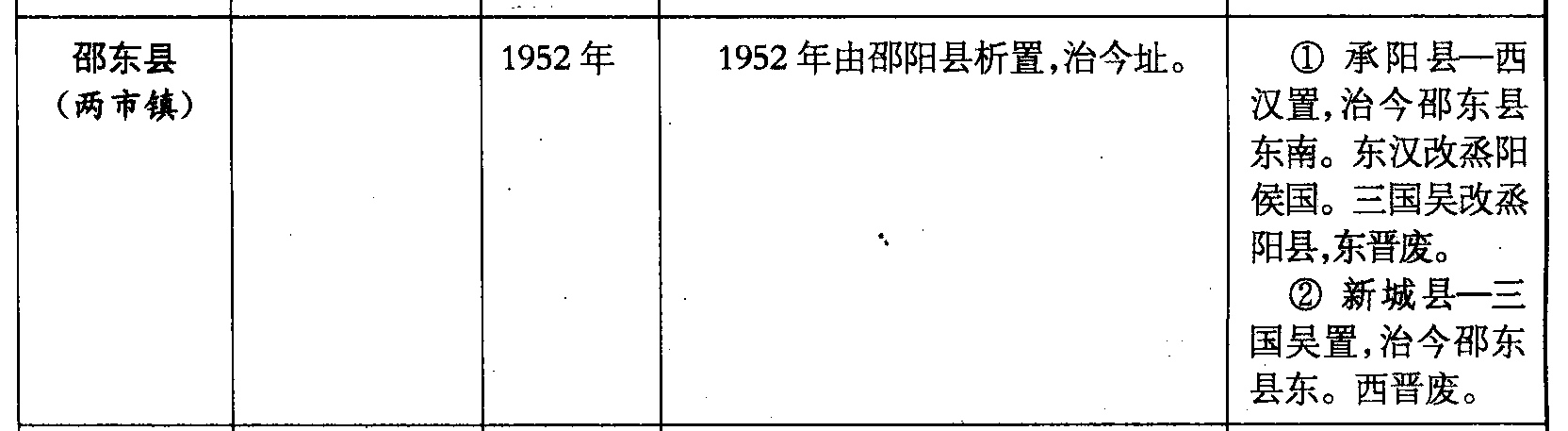 邵东县(两市镇)1952年1952年由邵阳县析置,治今址。❶ 承阳县—西汉置,治今邵东县东南。东汉改烝阳侯国。三国吴改烝阳县,东晋废。❷ 新城县—三国吴置,治今邵东县东。西晋废。