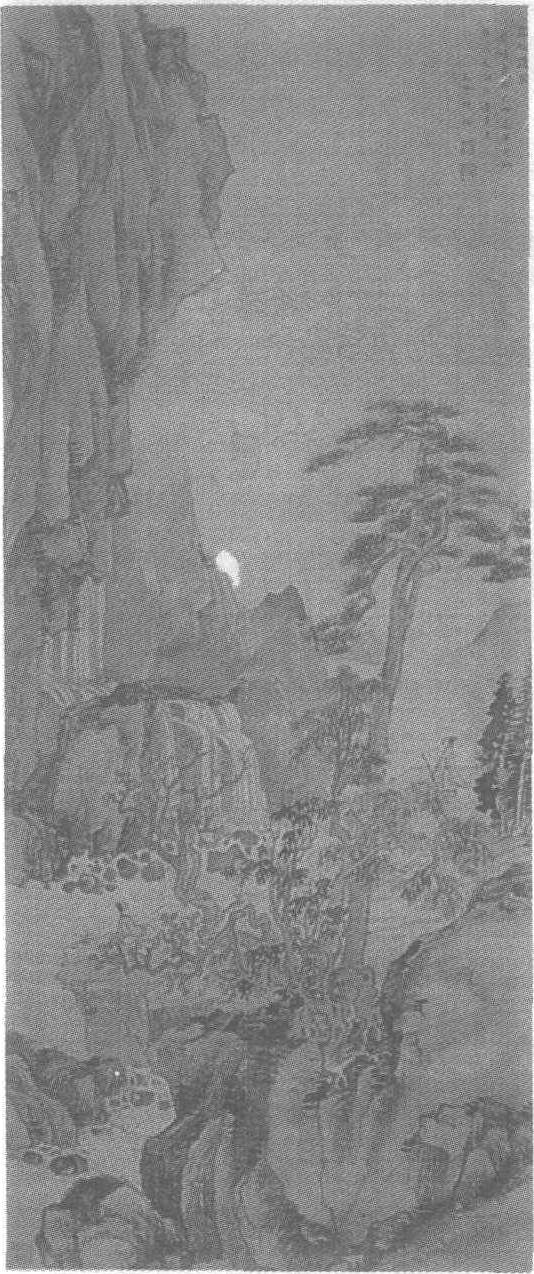 明崇祯己卯(公元1639年)。邵弥绘。纸本设色。纵144.3厘米,横60.4厘米。上海博物馆藏。邵弥(约公元1592—1642年),字僧弥,号瓜畴、芬陀居士,江苏吴县人,明末吴派名家,与董其昌、王时敏、王鉴、李流芳、杨文骢、程嘉燧、张学曾、卞文瑜共为“画中九友”(董其昌“南北宗”理论影响下,以董其昌为中心形成的文人画派)。他擅画山水,师荆浩、关同,取法元人,略参南宋笔意,以“清瘦枯逸,闲情冷致”的秀美风格著称。他还工花鸟,并能诗善书。其传世作品有:《云山水阁图轴》、《仿子久禹玉二卷山水图》、《莲花大士图》、《仿古山水图册》等。此图是他的晚年作品。江左危壁直立,高耸入云,瀑布飞流直下,云雾笼罩远山。壁下一人,拄杖而立,仰观瀑布。隔岸崖岩上,一孤松高高挺立于虬曲的杂树间。悬空的平石上,一人盘膝坐于树下,眺望着烟云弥漫的远方。画的右上角,有署款:“高松远涧,崇祯岁旅己卯嘉平日,似存翁大词宗老先生,瓜畴邵弥。”钤白文印两方。此图运笔以皴带染,水墨淋漓,气势磅礴,具有撼人心弦的威慑力。