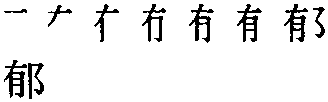 【提示】在汉字简化前,表示“ (草木) 茂盛”“ (忧愁、愤怒等情绪) 在心里积聚不得发泄” 等义和用于地名 “郁林”、植物名 “郁金香” 时,写作繁体的“鬰”; 表示 “香气浓烈”、用于地名 “郁夷” 时,写作 “郁”; 用于姓氏时,鬱与郁是两个不同的姓。在异体字整理前,鬰、欝是 “鬰” 的异体。 左下是⺝, 起笔是竖, 不是撇。月单独位于字或部件下面时,起笔的竖撇改成竖。月中间的两横,宋体与左右两边相接,楷体与左边相接,与右边相离。阝,2画,起笔是横撇弯钩;旧字形3画,起笔是横撇。 *郁1yù8画 邑部 (1) 香气浓烈: ~烈|馥~。 (2) 姓。