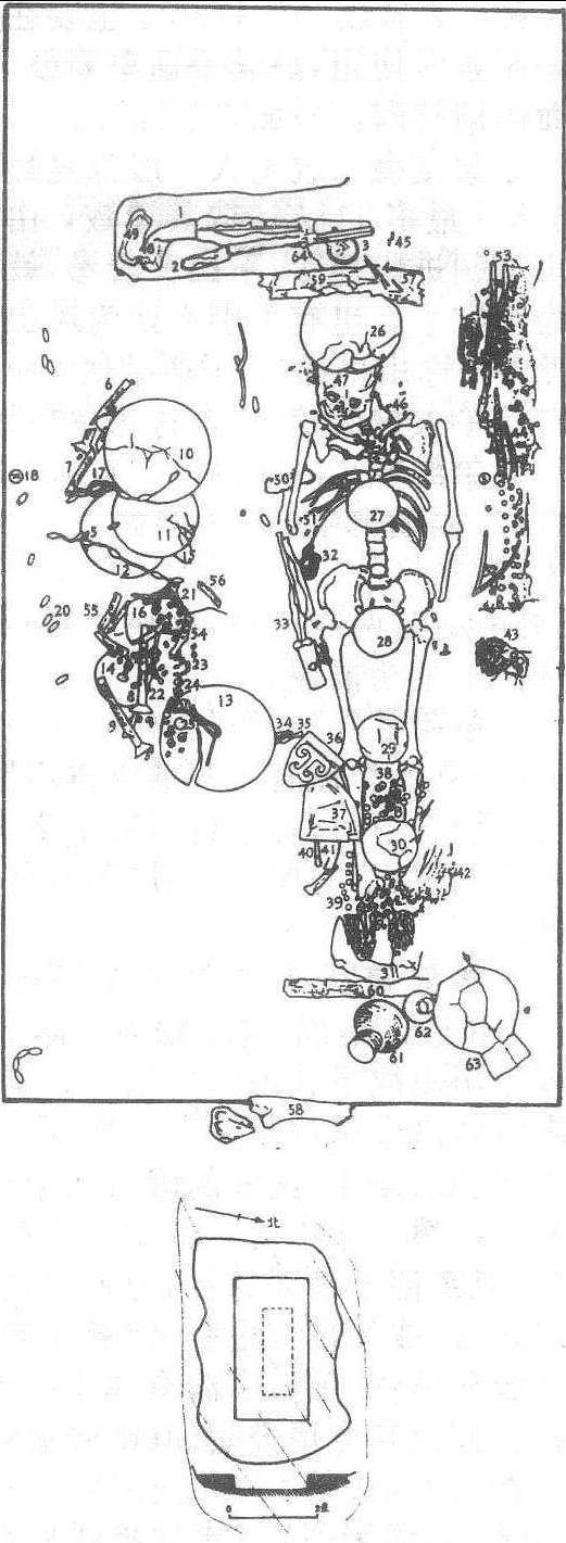释义 | 郑家洼子青铜短剑墓地春秋时期东胡族墓地。位于沈阳市于洪区杨士乡郑家洼子村南,1965年发掘14座,面积约2万平方米。墓地分为南北两区,北区是12座小型的奴隶土坑墓,南区是两座大型的奴隶主棺椁墓,墓皆东西向。其中6512号大墓,呈不规则长方形,葬一老年男性,头西足东,仰身直肢。棺与椁之间放置随葬品,有铜、陶、石、骨器共42种797件。以铜器最多,其中兵器有短剑、镞;随身用具有双钮镜、镜形饰、刀囊饰牌、刀、锥、斧囊饰牌、斧、凿、石串珠、铜簪、骨簪、骨针;马饰有镳、衔、节约、喇叭形器、图形饰、游环绞具、管、泡、珠;陶器有泥质灰陶壶。北区的土坑墓大多数一无所有。南北墓地对比悬殊,说明阶级分化,等级存在,是处在奴隶制阶段的一处墓地。1985年2月,市政府将6512号墓列为市级文物保护单位,并于1986年建陈列馆对外开放。 (1.2.33短剑、3.双钮镜、4.簪5.19.绞具、6—9喇叭形器、10—16圆形饰、17. 圆环、18.25. 马头泡饰、19. (原缺)、20管、22. 镶衔、23.珠、24.节约、26—31镜形饰,32.七连环34斧35凿、36斧囊37. 刀囊饰牌38. 靴上大泡、39. 靴上小泡、40.锥41.刀42.Ⅰ式镞43.Ⅱ式镞、44.弓囊上泡饰45.销、46.大石串珠、47小石串珠48—50剑把上石饰、51.石佩珠52—53.弓囊和弓弭54—56.骨鏕57.骨簪、58. 牛骨、59—60板灰、61—63 陶壶、64. 骨针) |