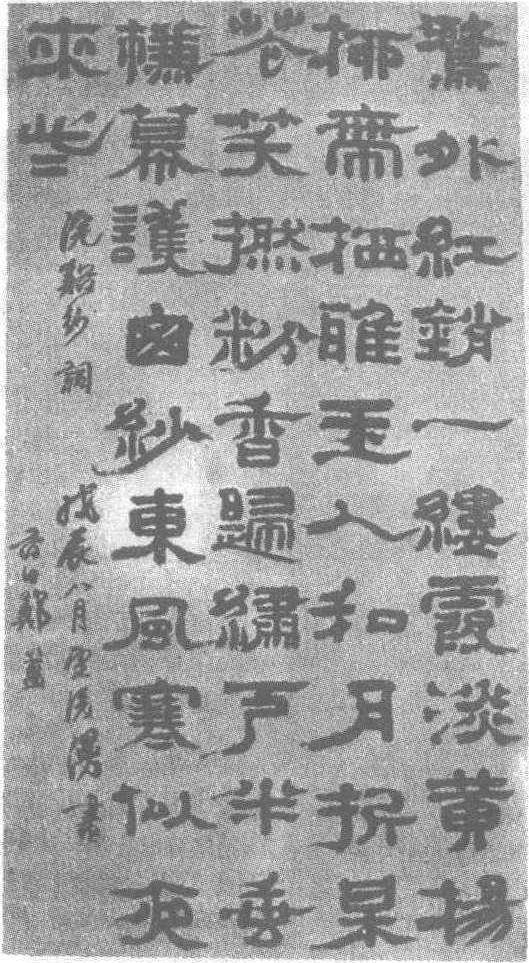 清。纸本。纵173.6厘米,横89.6厘米。上海博物馆藏。郑簠(明天启二年—清康熙三十一年,即公元1622—1693年),字汝器,号谷口,上元(今江苏南京)人,以行医为业,终生不仕。善刻印,工书,少时便矢志习隶书,于《史晨碑》、《曹全碑》临摹甚勤,曾不遗余力购求天下汉碑,家藏积有四厨,并沉酣于汉碑达30余年。他倡学汉碑,对后来汉隶之学的复兴颇具影响。他自称:“作字最不可轻易,笔管到手,如控千钧弩,少弛则败矣。”其学生张在辛对郑簠书评价云:“作字正襟危坐,肃然以恭,执笔在手,不敢轻下,下必迟迟,敬慎为之。”清方朔《枕经堂题跋》曹全碑跋:“国初郑谷口山人专精此体,足以名家,当其移步换行,觉古趣可挹。至于联扁大书,则又笔墨俱化为烟云矣。”近人马宗霍《霋岳楼笔谈》云:“谷口分隶,在当时殊有重名,以汉石律之,知其未入古也。然笔较唐分则稍纵,故尚不伤雅。”此《浣溪沙》词:“鹭外红销一缕霞,淡黄杨柳带栖睢,玉人和月折杲花。笑捻粉香归户,半垂帘幕护窗纱,东风寒似夜来些。”下有款署“浣溪沙词”、“戊辰八月”。“戊辰”即公元1688年,时郑氏66岁。此隶书法从《曹全碑》、《史晨碑》,并融有篆意,字体宽博,以横画取势,用笔爽捷而净简,行笔泼辣,放则纵肆,守则凝厚,奇正参差,巧拙互补,苍迈伟阔。章法排列紧密,书味洋溢,情趣盎然,于婉丽媚巧中有高雅之气。