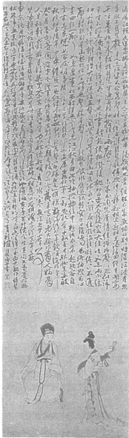 释义 | 郭诩琵琶行图轴 郭诩琵琶行图轴明。郭诩(见《郭诩东山携妓图轴》条目)绘。纸本墨笔。纵154厘米,横46.6厘米。北京故宫博物院藏。《琵琶行》是唐代大诗人白居易的长诗。诗人在唐宪宗元和十一年(公元819年)间因直谏被贬为江州(今江西九江)司马,次年作《琵琶行》,通过描写沦落江湖的歌女的不幸遭遇来抒发自己的愤懑心情。此图郭诩根据诗意而作,描绘的是诗人白居易与歌女邂逅的情形。歌女怀抱琵琶,头绾高髻,身穿拖地长裙,体态丰腴,容貌秀美,面向诗人垂目而立,神情忧郁,似乎在向诗人诉说自己的不幸境遇。诗人正襟端坐于旁,双手抚膝,温文持重,神情肃然,似乎正在倾听歌女的诉说,并且有所感悟。人物刻画得细致入微,形神兼备,与诗中“同是天涯沦落人,相逢何必曾相识”这一主旨相吻合。此图不设背景,上方是画家自书的行草《琵琶行》全诗,幅面占全图的2/3。署款“清狂画并书”,下钤〈仁弘〉等印二方。 ☚ 吴伟武陵春像卷 张路吹箫女仙图轴 ☛ |