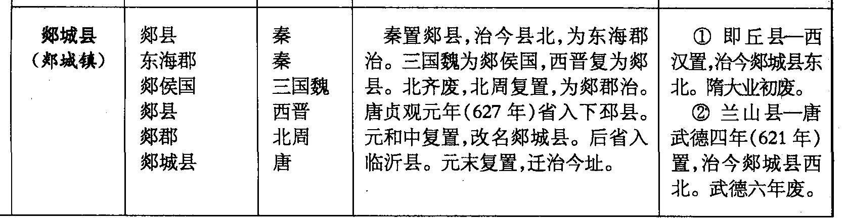 郯城县(郯城镇)郯县东海郡郯侯国郯县郯郡郯城县秦秦三国魏西晋北周唐秦置郯县,治今县北,为东海郡治。三国魏为郯侯国,西晋复为郯县。北齐废,北周复置,为郯郡治。唐贞观元年(627年)省入下邳县。元和中复置,改名郯城县。后省入临沂县。元末复置,迁治今址。❶ 即丘县—西汉置,治今郯城县东北。隋大业初废。❷ 兰山县—唐武德四年(621年)置,治今郯城县西北。武德六年废。