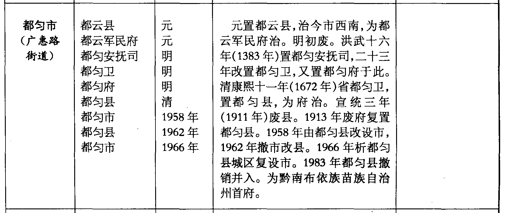 都匀市(广惠路街道)都云县都云军民府都匀安抚司都匀卫都匀府都匀县都匀市都匀县都匀市元元明明明清1958年1962年1966年元置都云县,治今市西南,为都云军民府治。明初废。洪武十六年(1383年)置都匀安抚司,二十三年改置都匀卫,又置都匀府于此。清康熙十一年(1672年)省都匀卫,置都匀县,为府治。宣统三年(1911年)废县。1913年废府复置都匀县。1958年由都匀县改设市,1962年撤市改县。1966年析都匀县城区复设市。1983年都匀县撤销并入。为黔南布依族苗族自治州首府。