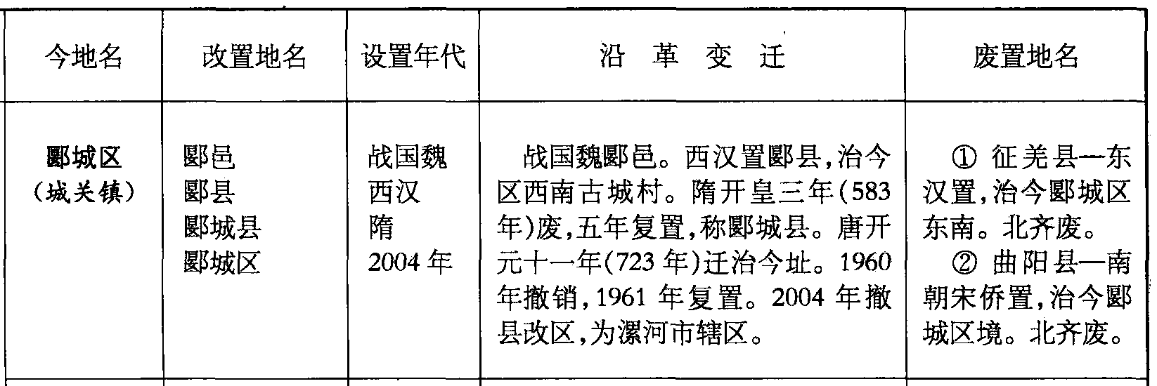 郾城区(城关镇)郾邑郾县郾城县郾城区战国魏西汉隋2004年战国魏郾邑。西汉置郾县,治今区西南古城村。隋开皇三年(583年)废,五年复置,称郾城县。唐开元十一年(723年)迁治今址。1960年撤销,1961年复置。2004年撤县改区,为漯河市辖区。❶ 征羌县—东汉置,治今郾城区东南。北齐废。❷ 曲阳县—南朝宋侨置,治今郾城区境。北齐废。