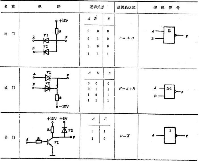 由电阻、电容、二极管、晶体管等器件构成的各种门电路,统称为分立元件门电路。由于分立元件门电路存在体积大和可靠性差等缺点,故在实际应用中已被集成门电路所替代。分主元件基本门电路的电路、逻辑关系、逻辑表达式及逻辑符号见表8.3-26。