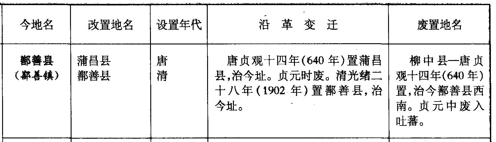 鄯善县(鄯善镇)蒲昌县鄯善县唐清唐贞观十四年(640年)置蒲昌县,治今址。贞元时废。清光绪二十八年(1902年)置鄯善县,治今址。柳中县—唐贞观十四年(640年)置,治今鄯善县西南。贞元中废入吐蕃。