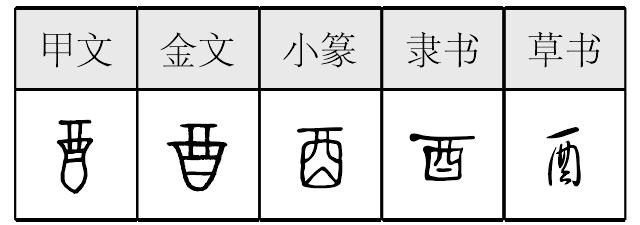 酉 甲骨文; 金文; 篆yǒu[象形,像酒罎形。(《説文》:“酉,就也,八月,黍成,可爲酎(zhòu)酒。象古文酉之形也。 ,古文酉。從卯,卯爲春門,萬物已出。酉爲秋門,萬物已入,一,閉門象也。”酉,初文像酒罎形。酉,“酒”本字。借爲地支第十位。古代用地支計時,酉時相當於下午五到七點鐘。)] [唐] 白居易《醉歌》:“黄雞催曉丑時鳴,白日催年酉前没。”(丑時:一時至三時。酉時:十七時至十九時。) 酉(yǒu)“ ,就也。八月,黍成,可为酎酒。象古文酉之形。凡酉之属皆从酉。 ,古文酉,从卯。卯为春门,万物已出;酉为秋门,万物已入。一,闭门象也。”(与久切) 段玉裁注:“就,高也。《律书》曰:‘酉者,万物之老也。’《律历志》曰:‘留孰于酉。’《天文训》曰:‘酉者,饱也。’《释名》曰:‘酉,秀也。秀者,物皆成也。’……酎者,三重酒也。……古文酉,谓 也。仿佛 字之形而制酉篆,此与‘弟从古文弟之形’、‘民从古文民之形’、‘革从古文革之形’为一例。”许慎用“就”释“酉”为声训。“酉”表示夏历八月,此月黍成熟,可以酎酒。 甲骨文作 、 、 、 ,象酒尊。金文或作 、 、 、 、 、 、 等,战国江陵秦家嘴楚简作 ,包山楚简作 ,睡虎地秦简作 。“酉”字构意为酒樽之象。徐复说:“酉本为盛酒之尊,因之所盛之酒亦曰酉。卜辞京一〇〇一用酉为酒。……自酉借为干支,初义遂失。”[1] 酉部有六十六个属字。以“酉”为表意偏旁的字,意义大都与酒有关。如“酒”字下云:“就也。所以就人性之善恶。从水,从酉;酉亦声。一曰:造也,吉凶所造也。古者仪狄作酒醪,禹尝之而美,遂疏仪狄。杜康作秫酒。”又如“醫”字下云:“治病工也。殹,恶姿也。醫之性然,得酒而使,从酉。王育说。一曰:殹,病声。酒所以治病也。《周礼》有醫酒。古者巫彭初作醫。”再如“莤”字下云:“礼祭,束茅,加于祼圭,而灌鬯酒,是为莤。象神歆之也。一曰:莤,榼上塞也。从酉,从艸。《春秋传》曰:‘尔贡包茅不入,王祭不供,无以莤酒。’” *酉yǒu7画 酉部 (1) 地支的第十位。 (2) 十二时辰之一,相当于下午五时至七时。 酉 ☚ 酉部 酒 ☛ 酉★常◎常