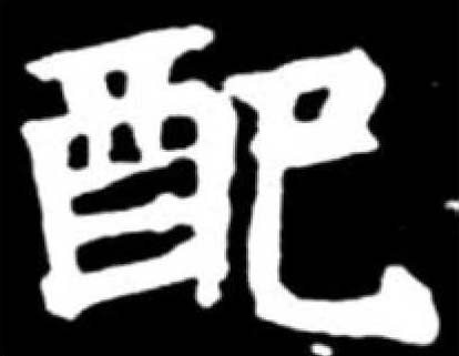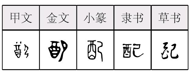 (籀·改) (篆·改) 配 甲骨文; 金文; 篆pèi[酉(酒,意符)+ 己(像人跪跽之形。意符)→ 配(《説文》:“配,酒色也。從酉,己聲。臣鉉等曰:己非聲。當從妃省。”配,徐鉉等認爲是“妃省聲”也不正確,“己”像跪跽的配酒奴。配,初文像勾兑酒的奴隸,擬爲“醜”字的異構體,即今之“配酒師”。酒經配製,其味更美,所以各大酒廠都高薪聘請名配酒師,勾兑所产之酒,使具特色。這樣的配方是相互保密的。配好的酒分給各人〈分配〉;雌雄動物發生的性行爲〈交配、配種〉;襯托〈配角、搭配〉;補缺〈配零件、配齊、配鑰〉;相當,符合〈配得上,紅花配绿葉〉;軍〈發配〉。)] 《詩經·周頌·思文》:“思文後稷,克配彼天。”(思念後稷先王,功德堪配上蒼。) 配pèi(10画)